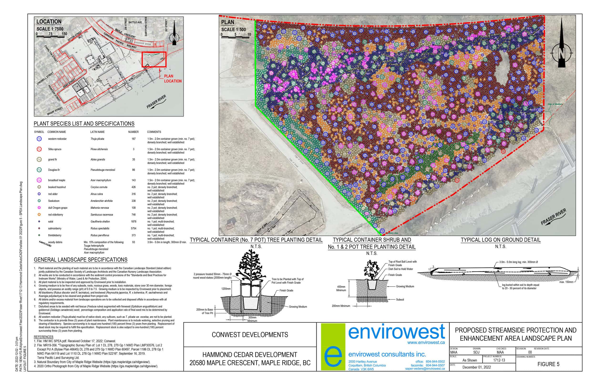 A Watercourse Protection Development Permit is required by the City of Maple Ridge for any new development within 50m of a water feature, including streams, wetlands, ponds, or ditches, to establish the preservation, protection, restoration and enhancement of watercourse and riparian areas. Conwest received its Watercourse Protection Development Permit for the Hammond site from the City of Maple Ridge on January 23, 2023. Working together with Qualified Environmental Professionals and Municipal Environmental Staff, we have created this riparian area, which will be planted with native plants to ensure the preservation and protection of riparian areas and watercourses.